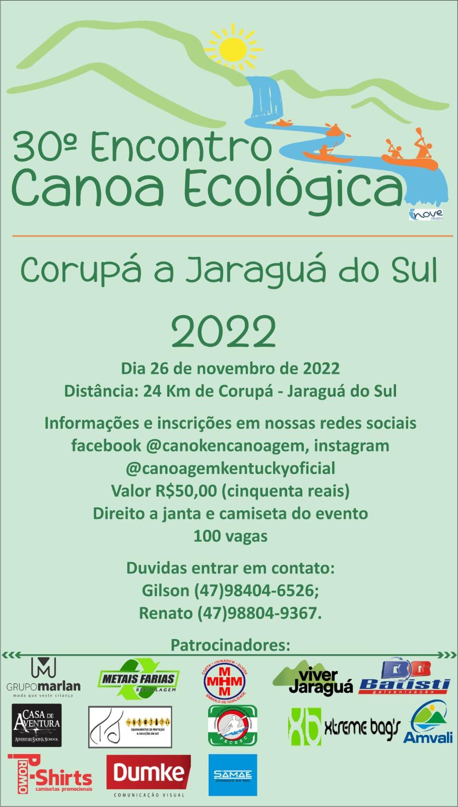 A Diretoria de Turismo da Secretaria de Desenvolvimento Econômico e Inovação da Prefeitura de Jaraguá do Sul informa que está abertas as inscrições para o 30º Encontro Canoagem Ecológica. O evento ocorre no próximo sábado (26) num percurso aproximado de 24 quilômetros entre os municípios de Corupá a Jaraguá do Sul.