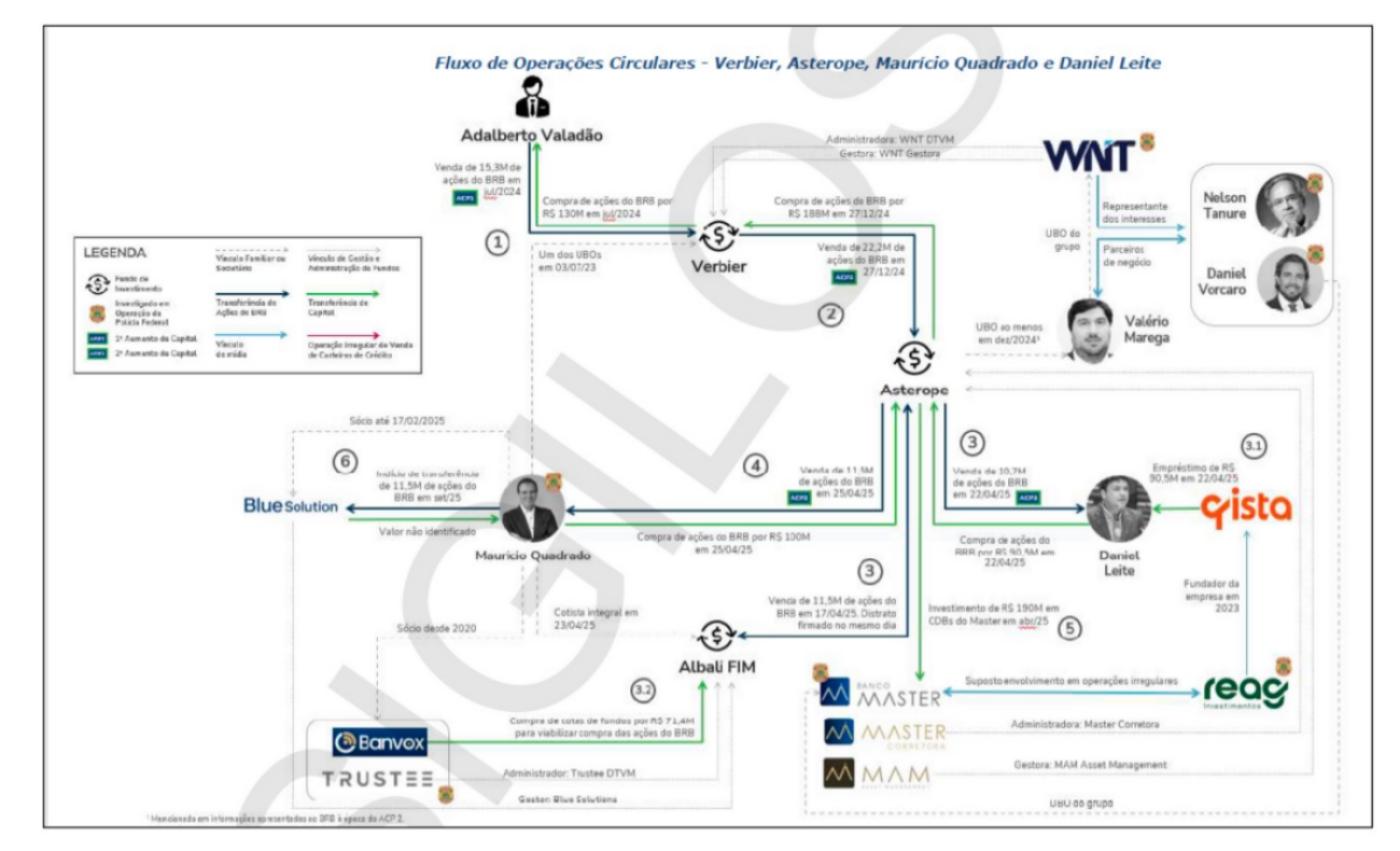 “A engenharia de triangulação envolveu: (a) pessoas físicas que atuaram como meros veículos de passagem, sem animus de investimento ou assunção de risco próprios, como Adalberto Valadão e Leonardo Augusto, que receberam juntos aproximadamente R$ 265 milhões para subscrever ações no ACP 1 e posteriormente aliená-las aos fundos Borneo e Verbier; e (b) fundos administrados e geridos por entidades do grupo Reag e Master Corretora, como Borneo, Delta, Deneb, Asterope FIP, Celeno, entre outros”, diz trecho do documento do BRB, representado pela Machado Meyer.