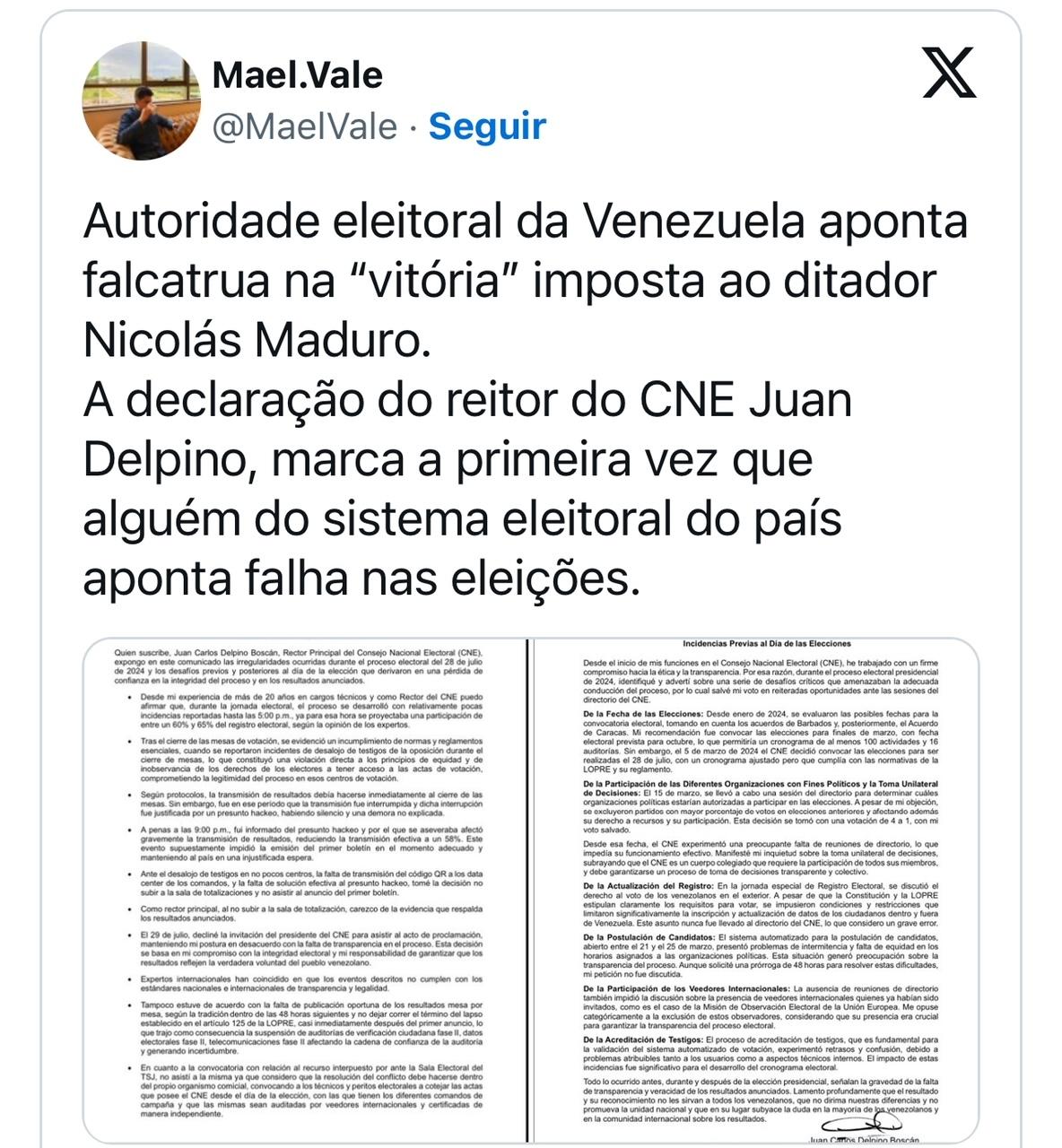 Reitor titular do Conselho Nacional Eleitoral venezuelano (CNE) Juan Delpino, afirmou que não compareceu à Sala de Totalização dos votos do CNE e, por isso, não tem evidência que respalde a vitória imposta ao ditador Nicolás Maduro.