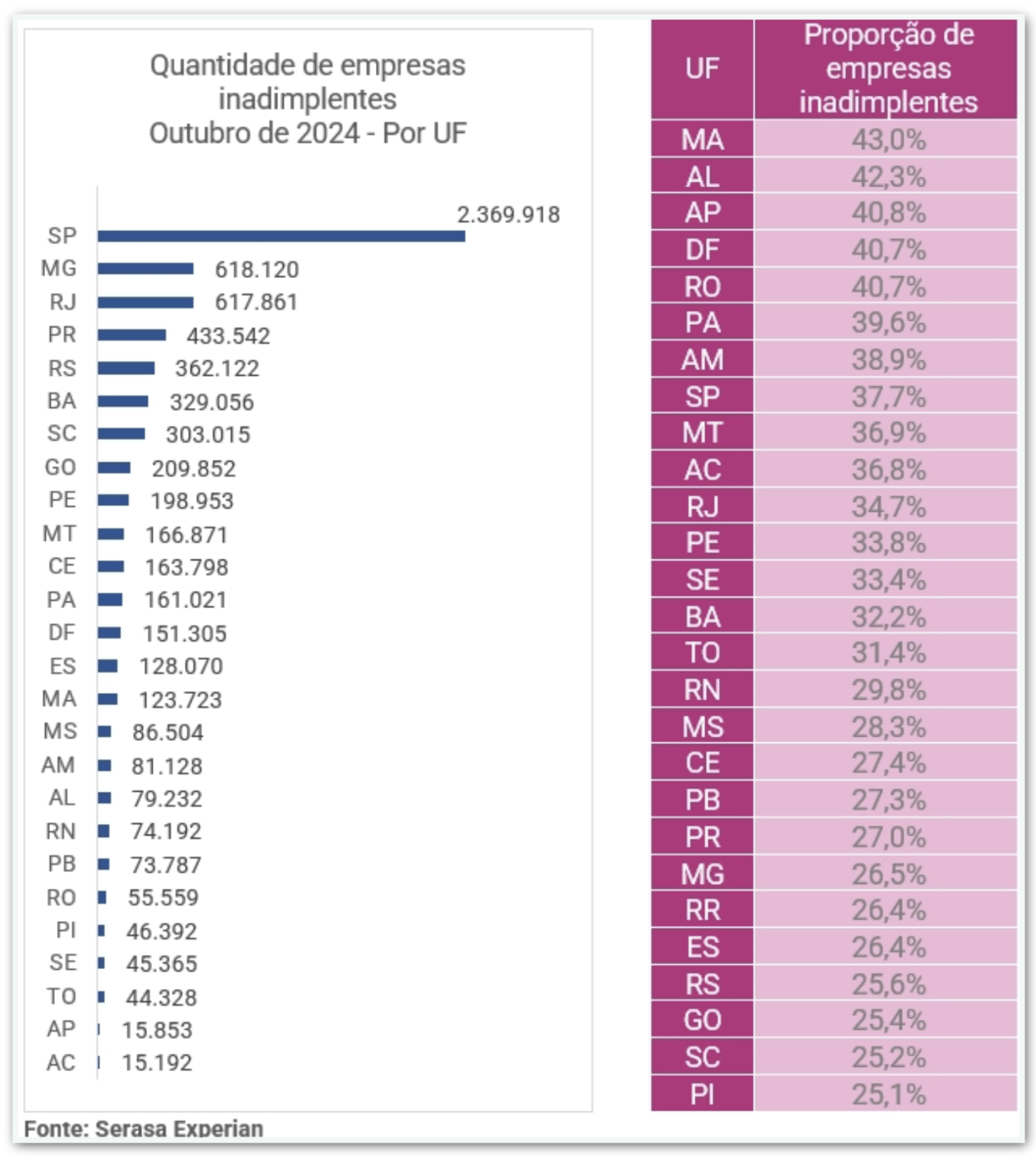 Outubro de 2024 registrou um novo recorde de inadimplência entre as empresas brasileiras, com 7 milhões negativados, o que representa 32,3% do total de empresas no país. O valor acumulado das dívidas atingiu R$ 156,1 bilhões, também o maior da série histórica do Indicador de Inadimplência das Empresas da Serasa Experian. Em média, cada CNPJ teve cerca de 7,4 contas negativadas no período.