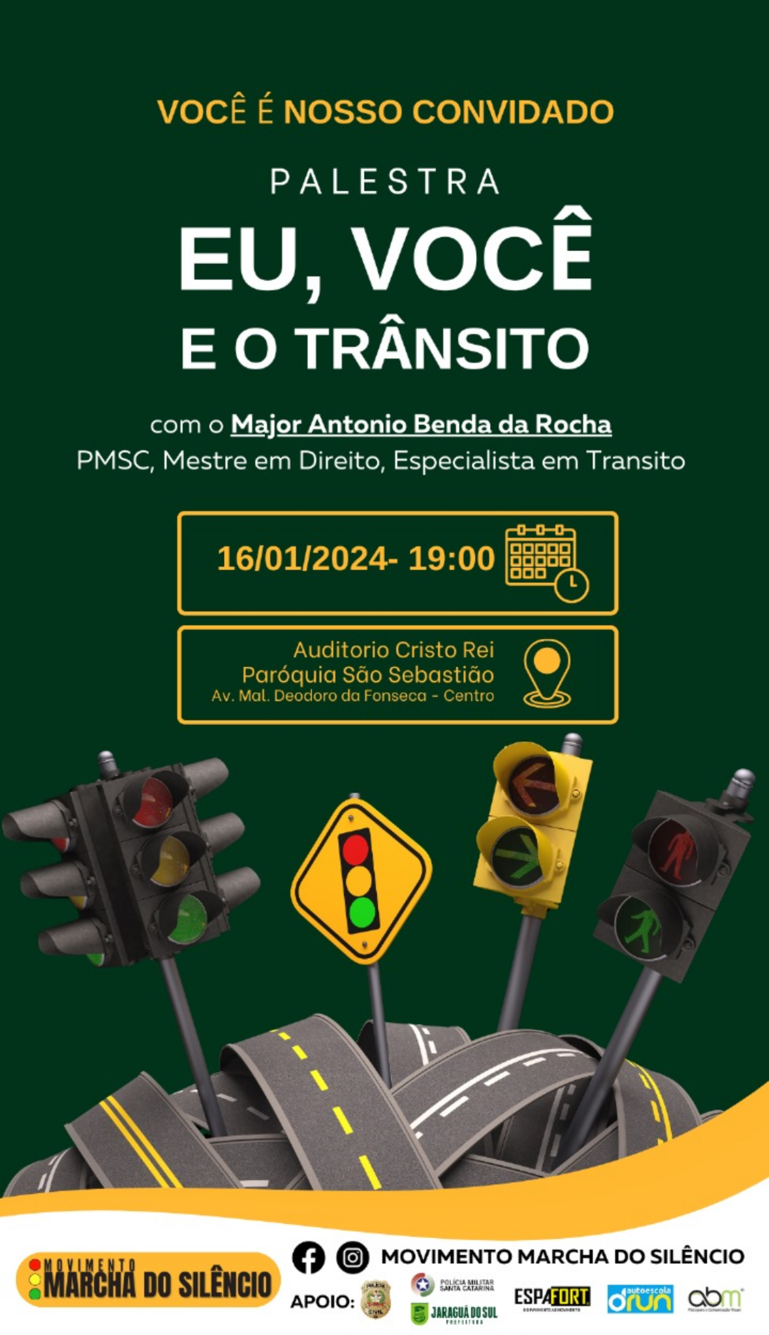 A Prefeitura de Jaraguá do Sul, por meio da Diretoria de Trânsito e Transportes da Secretaria Municipal de Planejamento e Urbanismo, convida para a palestra “Eu, você e o trânsito”, com o Major da Polícia Militar de Santa Catarina, Antônio Benda da Rocha, especialista em trânsito e Mestre em Direito. O evento é gratuito, aberto ao público, sem a necessidade de credenciamento e acontecerá na terça-feira (16), a partir das 19h, no Auditório Cristo Rei, da Paróquia São Sebastião, na Avenida Marechal Deodoro da Fonseca, no Centro.