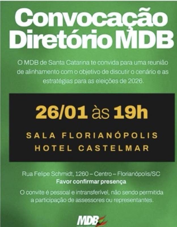 O MDB já marcou reunião do Diretório Estadual para o próximo dia 26 em Florianópolis.