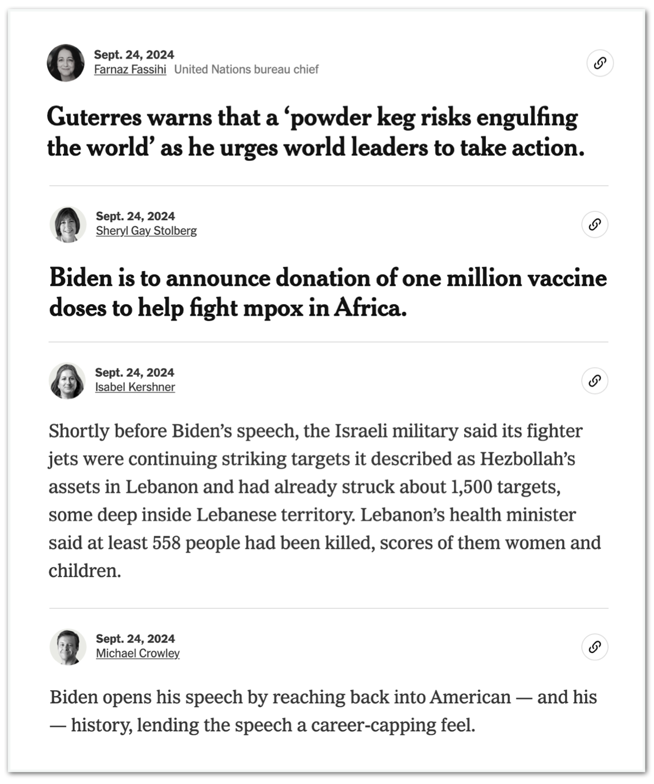 New York Times (EUA) – o principal jornal dos EUA fez uma cobertura jornalística em tempo real da Assembleia da ONU. O veículo ignorou Lula. Como é possível ver no print abaixo, há atualizações da declaração do secretário-geral António Guterres –que discursou antes do brasileiro. Depois, o NYT passa a falar do presidente dos Estados Unidos, Joe Biden (Partido Democrata) –que discursou depois do brasileiro.