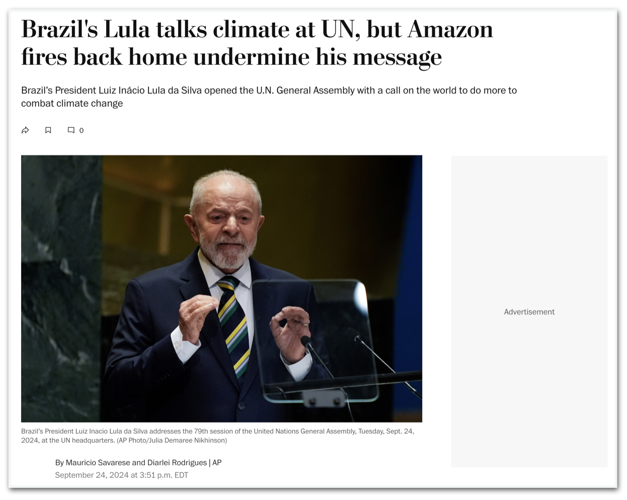 A edição impressa do Washington Post desta 4ª feira (25.set) traz uma reportagem sobre o discurso do presidente dos EUA, Joe Biden (Partido Democrata), na ONU. Não faz menção a Lula ou ao Brasil. O jornal publicou em seu site, na 3ª feira (24.set), um texto produzido pela agência de notícias Associated Press com o seguinte título: “Lula fala sobre clima na ONU, mas incêndios na Amazônia minam sua mensagem”.