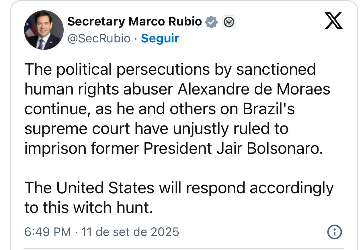 A nova manifestação reforça o tom adotado pela diplomacia trumpista desde o inicio do julgamento de Jair Bolsonaro. Rubio já havia classificado Moraes como “violador de direitos humanos” e suspendeu o visto do magistrado e de familiares próximos. A ofensiva foi seguida por outros integrantes do Departamento de Estado.