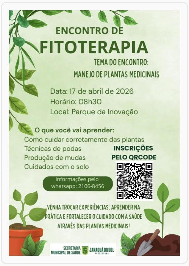 A Prefeitura de Jaraguá do Sul, por meio da Secretaria Municipal de Saúde, promoverá na sexta-feira (17), a partir das 8h30, no Parque da Inovação, mais um encontro sobre Fitoterapia. O tema desta vez será o “Manejo de Plantas Medicinais”.