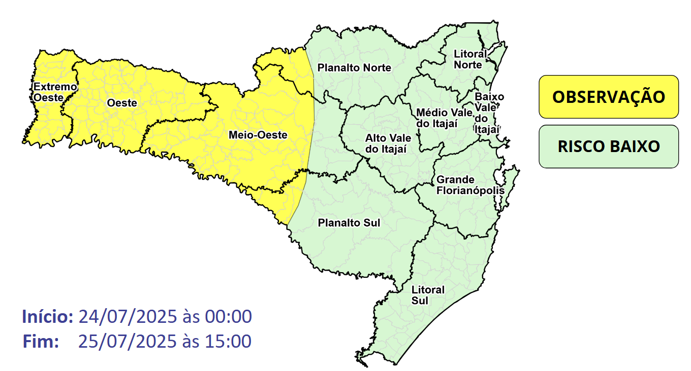 A Secretaria de Estado da Proteção e Defesa Civil de Santa Catarina (SDC/SC) emitiu um aviso para a ocorrência de chuvas e temporais isolados a partir da madrugada desta quinta-feira, 24, e ao longo da sexta-feira, 25. As instabilidades podem provocar alagamentos, destelhamentos, queda de galhos e danos à rede elétrica, especialmente nas regiões do Oeste, Meio-Oeste e Extremo Oeste, com risco classificado como baixo a moderado.