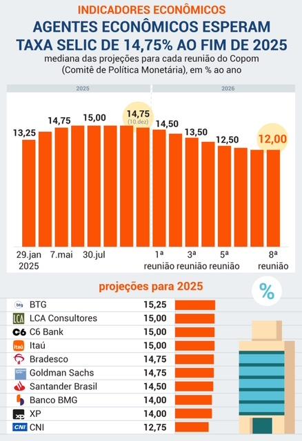 A taxa básica, a Selic, deve subir para 15% ou mais em 2025, patamar que não atinge desde 2006. O juro base está em 12,25% ao ano, mas a autoridade monetária indicou que irá subir em mais 2 pontos percentuais. Segundo o Boletim Focus, os agentes financeiros esperam uma alta de até, pelo menos, 15% em julho.